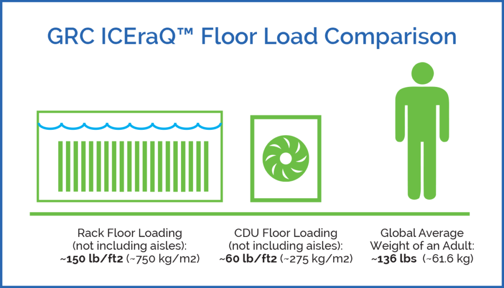 GRC liquid-immersion-cooling systems are designed to be installed on raised floors and concrete slabs alike. And while it may seem obvious, it is important to point out that when talking about floor loading, pressure on the floor is a more important consideration than gross weight alone. Because our racks are horizontal, they help evenly spread weight across their footprint, yielding a floor loading that is often less than that of an air-cooled rack.
