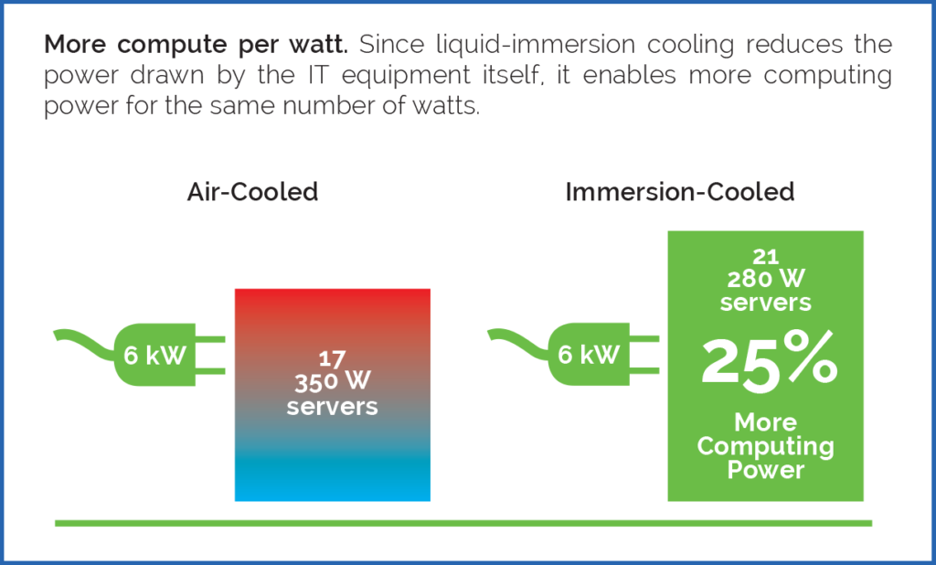 And since liquid-immersion-cooled servers use less power, they also allow you to significantly downsize backup generators, UPSs, batteries and more, which further reduces infrastructure costs. Overall, it’s like moving from an internal combustion engine to astate-of-the-art electric vehicle. All the little complex moving parts are replaced with fewer, more efficient components.