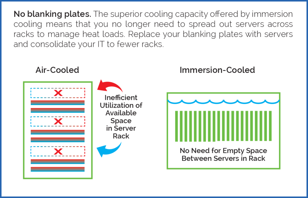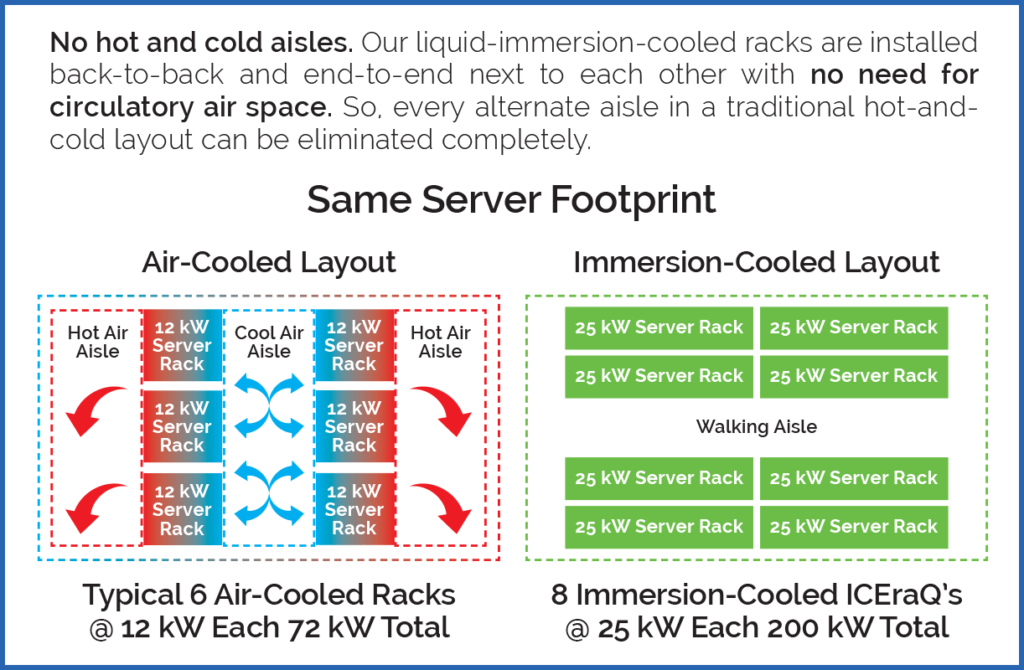 While it is true that an individual horizontal rack has a slightly larger footprint than a vertical rack, when you look at the fully burdened data center footprint, immersion cooling produces significant space savings: