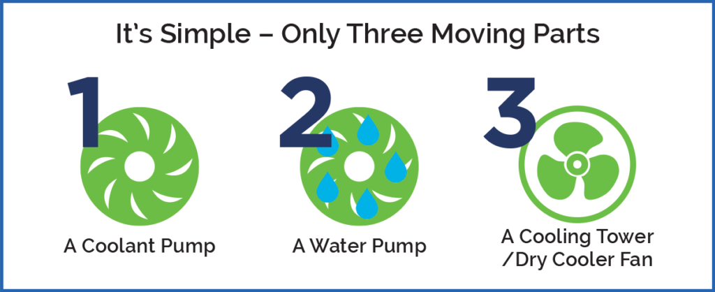 Simply changing the medium of heat transfer from air to our proprietary ElectroSafe™ coolant, eliminates a lot of complexity from the data center. Chiller plants, air handlers, humidity controls and the like are replaced with just three simple moving parts: a coolant pump; a water pump; and a cooling tower/dry-cooler fan. This translates into a more reliable system with fewer headaches for operators and technicians. So simple in fact, the only periodic maintenance required on the entire system is a filter change typically needed only once a year.